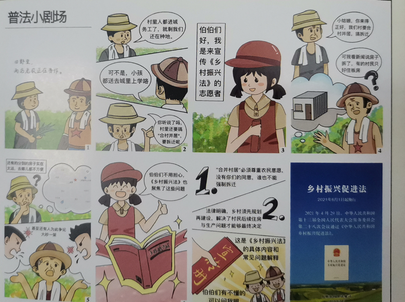 全面总结,积极创新,打造普法新境界。各组实践结果显示,关于文创产品,各社区和乡镇都会印发一些紧跟时事的法律相关的宣传册,但此类宣传册对于民众而言口吻较为官方,内容相对艰涩难懂,又因常常是将其放在宣传栏展示,没有广泛发放给群众,而群众也很少去关注这些宣传栏,所以宣传效果相对不足。实践访谈中采访到的村民、居民也表示,乡镇和社区都有宣传册,但是宣传册内容都很模糊,形式也比较死板,常常是大段文字,很难吸引人。但是村居宣传栏的布置是法治宣传的基本形式,为法治宣传教育活动提供参考。由此可以看出,生动有效、形象具体的涉及民生利益的法律相关文创产品具有很大需求。四个分队的同学们也就此现象进行讨论并对于后续法治宣传活动形式的创新化和文创产品内容的丰富化进行研究和规划,为进一步扩大影响范围,提高宣传效果做充足准备。目前团队正在计划成立公司,不断创作宣传画册等相关文创产品,为参与创新创业大赛做充分准备,相信在成员的共同努力下,我们的队伍会愈发坚韧与优秀,法治宣讲的未来也会更加丰富、精彩。