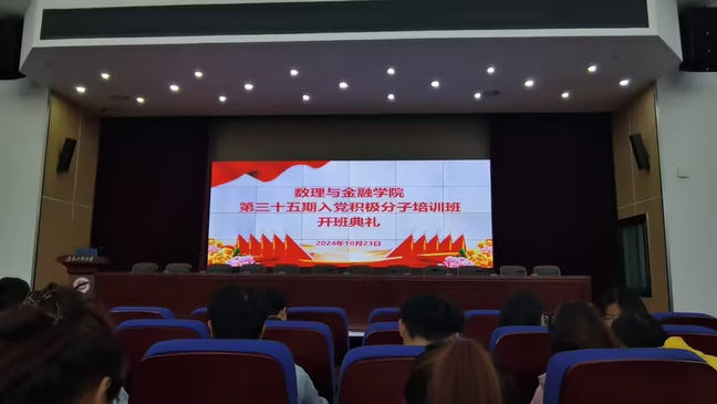 10月23日,数理与金融学院分党校在图书馆五楼会议室举行第三十五期入党积极分子培训班开班典礼暨新生入党启蒙第一课。校党校督导组成员刘宝玉、学院党委副书记何志恒、培训班班主任、全体学员和2024级全体新生参加开班典礼。