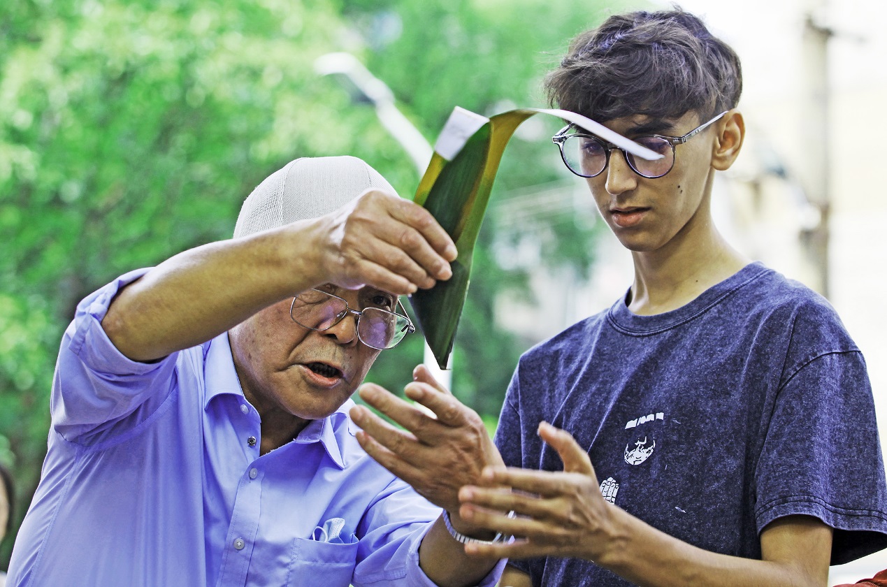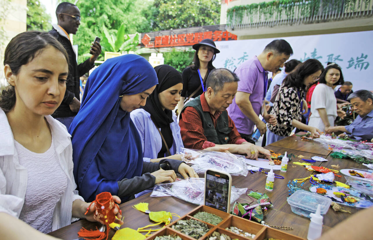 留学生们在社区志愿者的指导下,学习包粽子、制作香包等,感受中国非遗文化和传统手工艺的独特韵味。大家还品尝了绿豆糕、花茶等传统节日美食,进一步加深了留学生对中国端午习俗的了解。投壶比赛环节更是趣味横生,留学生同场竞技,欢声笑语不断。
