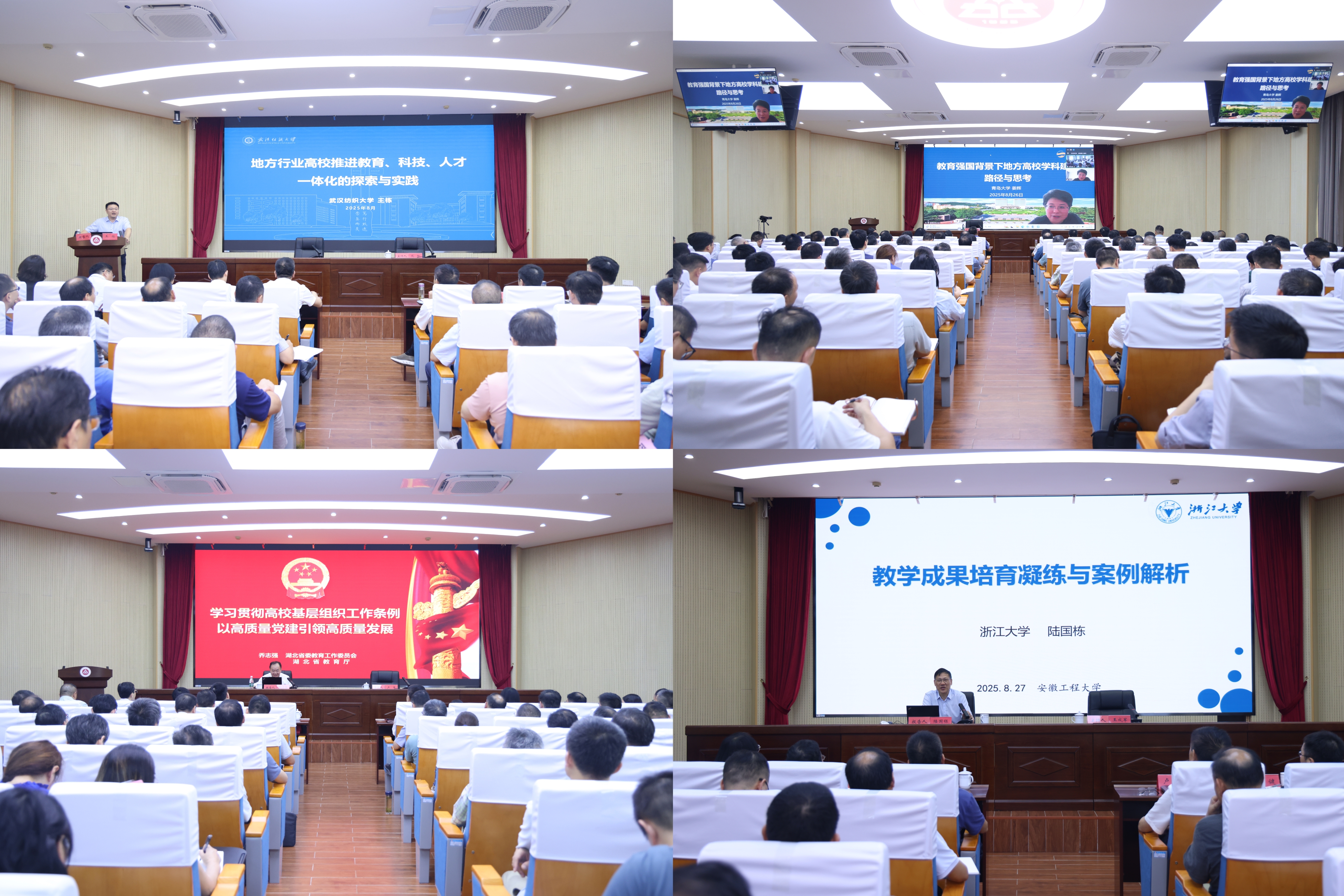 专题报告环节,学校邀请武汉纺织大学党委常委、副校长王栋,湖北省委教育工委、湖北省教育厅二级巡视员乔志强,青岛大学学科建设办公室主任姜辉,浙江大学机器人研究院常务副院长陆国栋,分别作题为《地方行业高校推进教育、科技、人才一体化的探索与实践》《学习贯彻高校基层组织工作条例以高质量党建引领高质量发展》《教育强国背景下地方高校学科建设路径与思考》《教学成果培育凝练与案例解析》的报告。