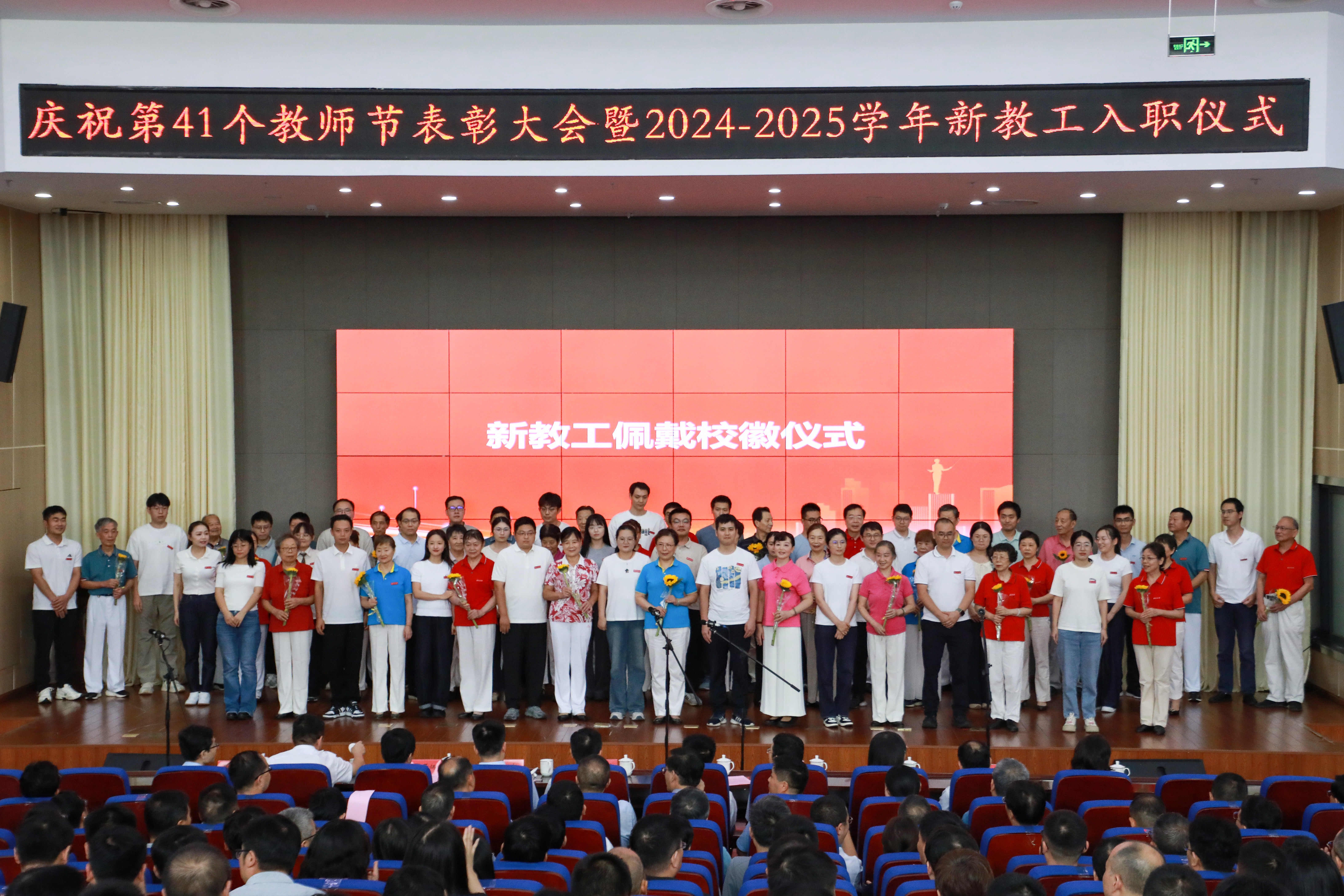 本网讯 9月10日,学校在图书综合楼5楼会议室举行庆祝第41个教师节表彰大会暨新教工入职仪式。校领导卢平、郑健、程双四、凤权、周虹屏、张开炳、王成军出席。相关职能部门、各二级单位主要负责人,受表彰教职工,全体新进教职工,离退休老同志和师生代表共计400余人参加。
